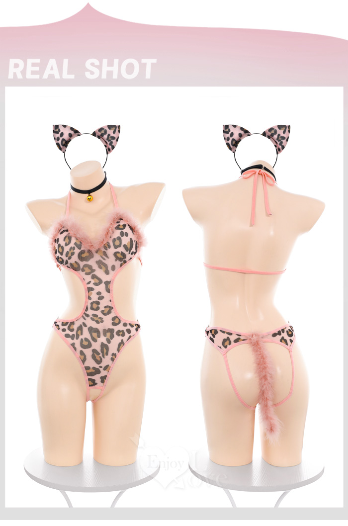 ►您現在的位置:首頁>貓咪角色扮演服!粉紅豹紋毛絨飾胸鏤腰露臀開襠連身衣三件組