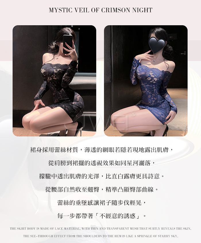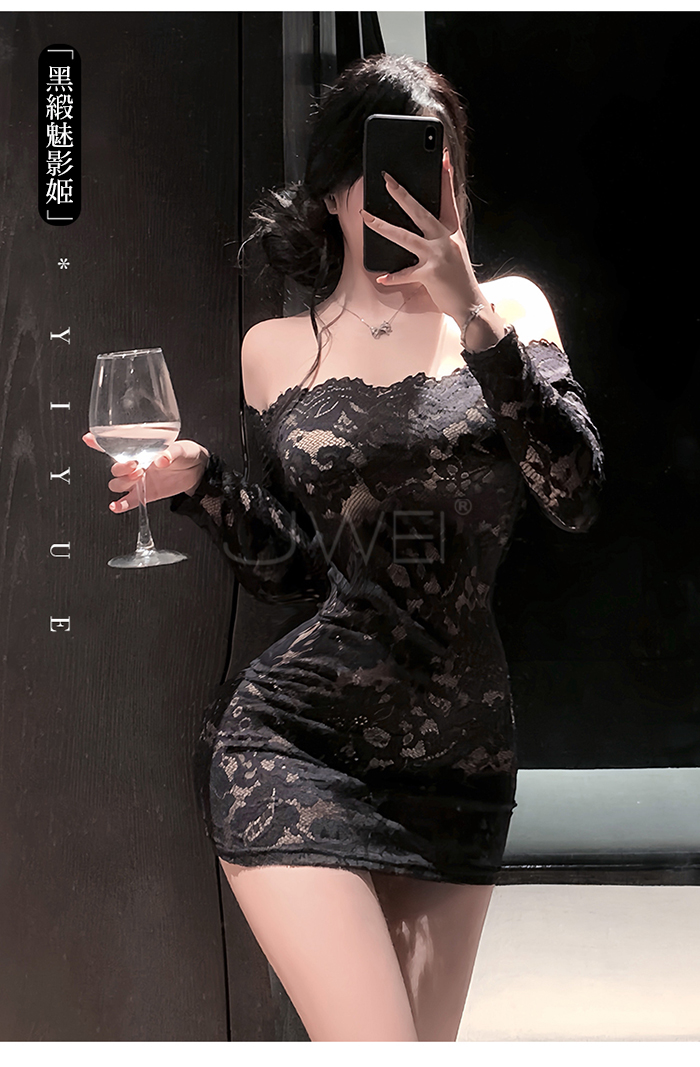 ►您現在的位置:首頁>花蔓朦朧.蕾絲雕花一字領透視包臀睡裙【連身裙+T褲+隱形肩帶-黑色】