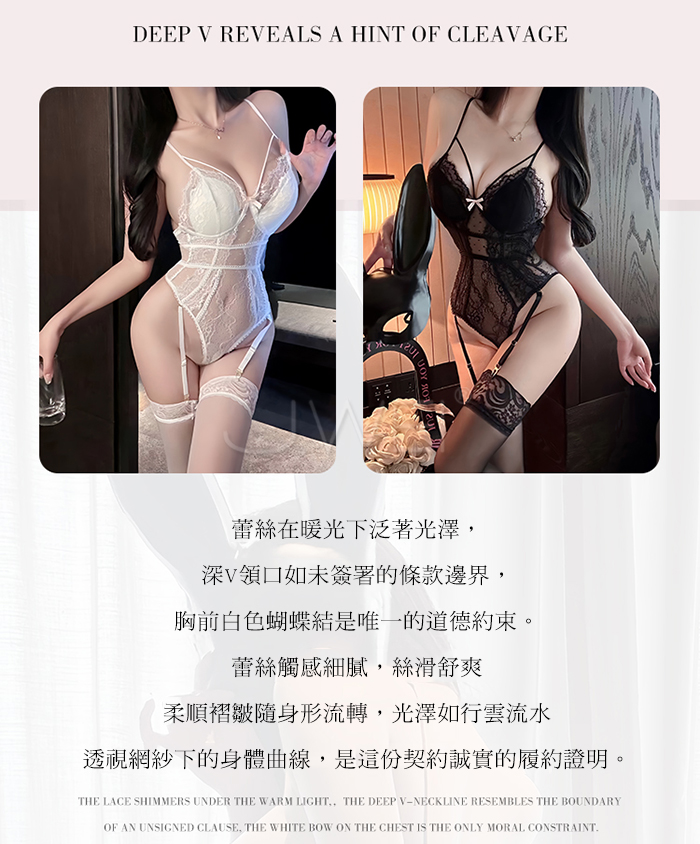 | 晝夜甜誘.蕾絲深V領口透視網紗暗扣開襠吊襪帶馬甲【黑色】