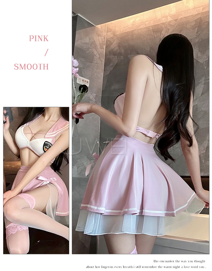►您現在的位置:首頁>甜心刑警.胸前交叉繫帶清純百褶透視白紗COS制服套裝【上衣+短裙-粉+白】