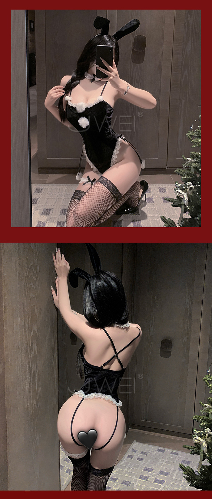 | 耶誕慾兔.蕾絲邊低胸毛球點綴絲絨性感兔女郎開襠連體衣【髮箍+頸環+連身衣+腿環-黑色】