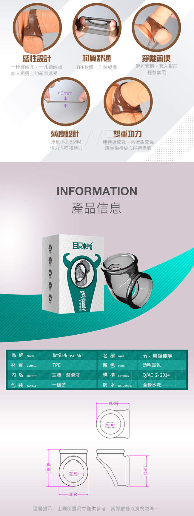 以柔軟矽膠為主材,外形設計流暢,仿人體工程學流線,柔軟矽膠手感舒適,環部可拉伸。