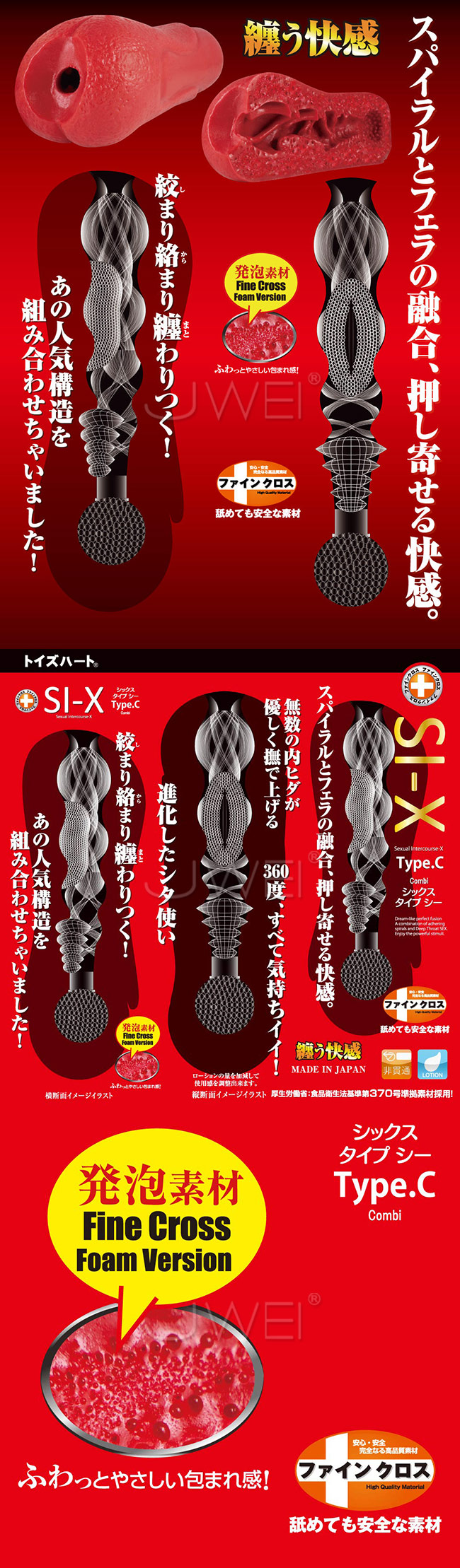 締まり絡まりまとわりつく! スパイラルヒダとフェラ刺激の融合を実現したSI-Xシリーズ待望の新作。 舐めても安全なファインクロス素材の発砲素材で作られたアイテムで、男根を奥へ奥へと誘うスパイラルヒダと、フェラチオのような感触を楽しめる内部構造が好評。 進化したシタ使いは何度でも味わいたくなる一品。 コンパクトサイズですが、確かな刺激を堪能できるハンディオナホです。