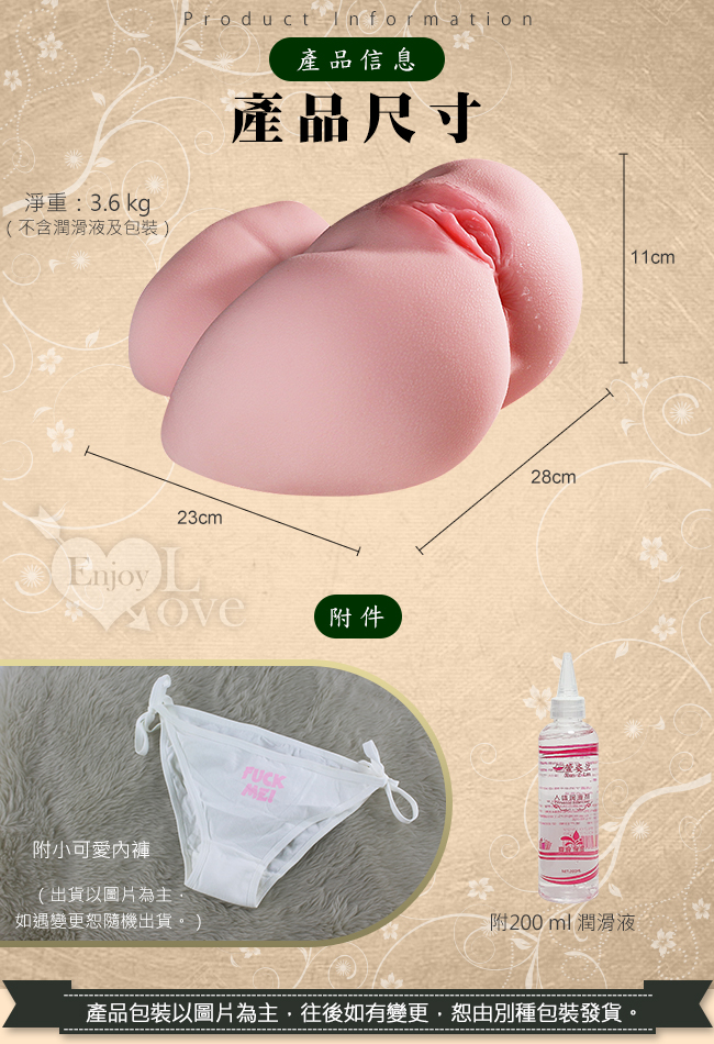 ※ 自慰器實體淨重3.6公斤(不含潤滑液及包裝)。