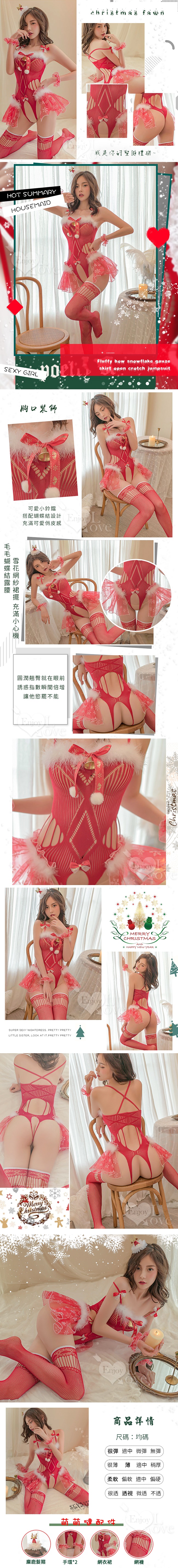 ►您現在的位置:首頁>魅力聖誕派對!毛毛蝴蝶結露腰雪花兩側紗裙開襠連身網衣四件式套裝