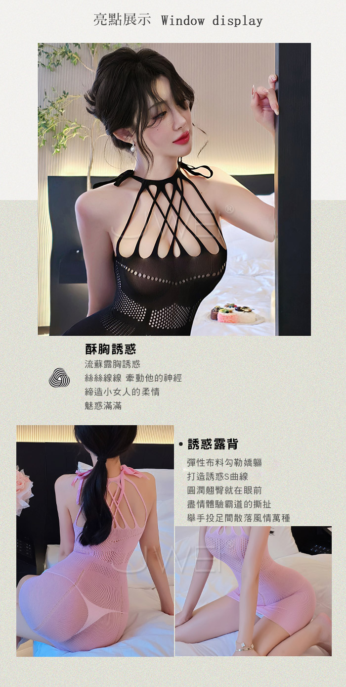 | 爵色風華.誘惑流蘇交叉露胸美背鏤空包臀網衣【粉色】