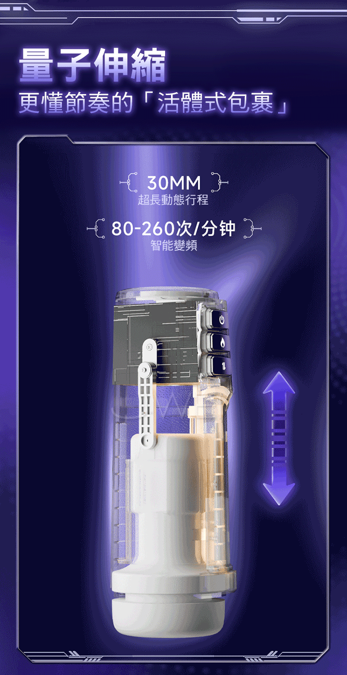 量子伸縮,更懂節奏的「活體式包裹」30MM超長動態行程,80-260次/分鐘智能變頻