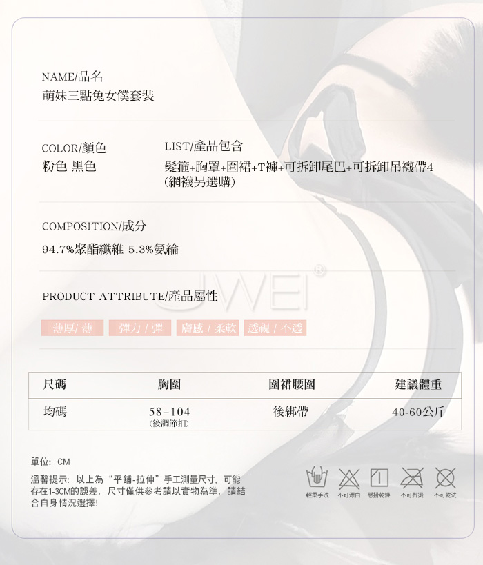 ■內容物:髮箍+胸罩+圍裙+T褲+可拆卸尾巴+可拆卸吊襪帶4