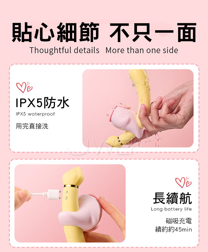 | ROSELEX 勞樂斯 ‧ 吻喜 10X10吸震遊走+舌撩陰乳 隱密盒裝舔吸組合雙蛋﹝內外同享+可獨立控制+USB充電﹞粉